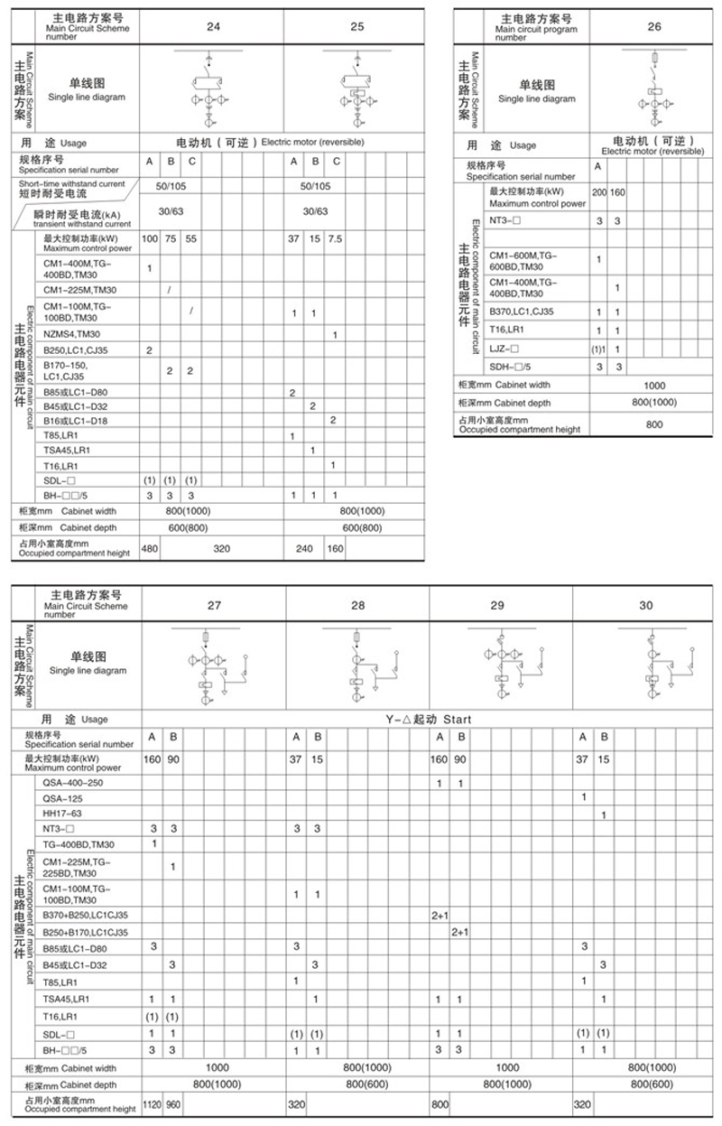装置主电路方案共33组118个规格(见下表},不包括由辅助电路的控制与保护的变化而派生的方案和规格,包括了发电、供用电和其它电力用户的需要,额定工作电流为4000A.适合2500kVA及以下的配电变压器选用。此外,为适应供用电提高功率因数的需